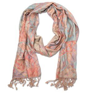 Floral Patchwork Design Scarf Tassels Coral Peach Blue Beige