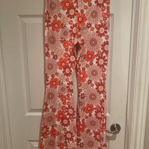 Vibrant floral patterned pants with a mix of red and pink flowers. Perfect for a bold fashion statement.