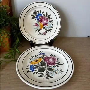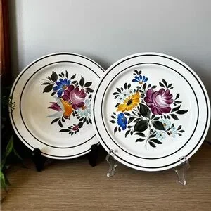 Beautiful plates with vibrant floral designs. Features pink, yellow, and blue flowers. Hand painted Hungarian “Granit” plates, 9.5” round! Beautiful to display or use!