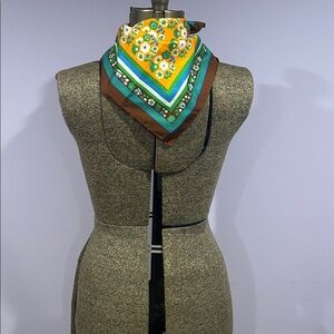 Vibrant scarf with a floral pattern. Features yellow, green, and brown colors. Measure 20”x20”. A little 70s vintage cutie! Also folds up into a fun patterned pocket square