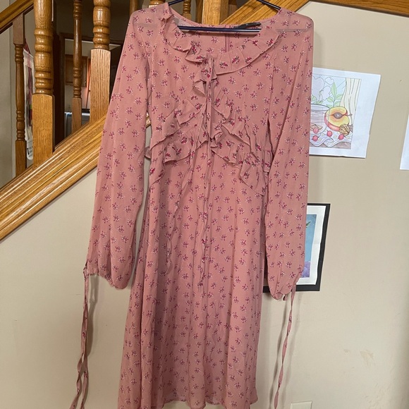 Elegant pink dress with floral patterns and ruffle details. Perfect for any occasion.