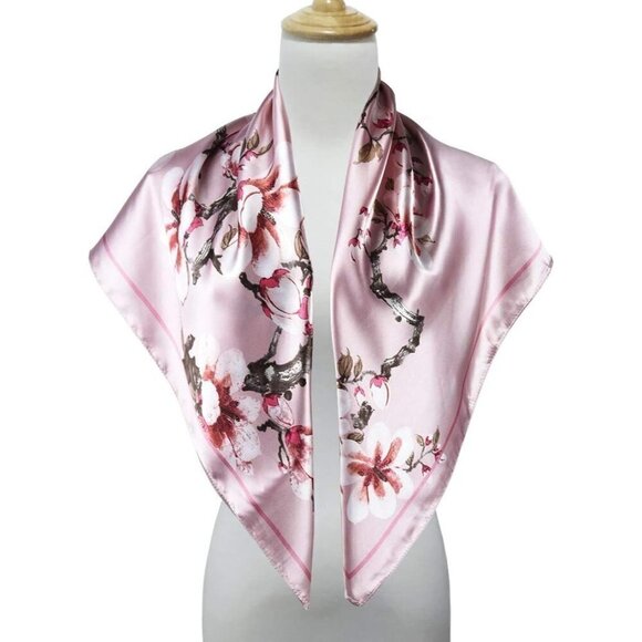 Elegant pink silk scarf featuring a beautiful floral design. Perfect for adding a touch of sophistication to any outfit.