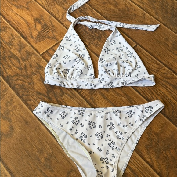 Chic and stylish floral print bikini set in white. Perfect for a day at the beach or poolside lounging.