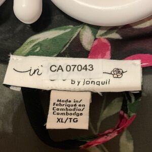 This floral print kimono robe featuring delicate lace accents at the sleeves is brand spanking new, tags on. Purchased, but have never reached for it. A perfect addition to your intimate wear collection, it features a pink and green floral print on a black background. Tie and belt loops. Measures approximately 21 inches from pit to pit. Thank you for looking !