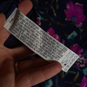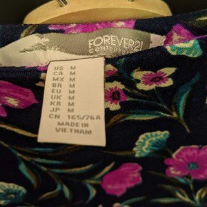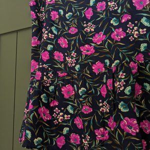 Dark blue skirt with pink floral pattern. Size Medium. Just above knee length. Polyester and machine washable.
