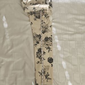 Stylish floral print jeans in cream and black. Perfect for a chic, casual look.