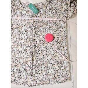 Pretty peasant style button down short sleeve top in a flower print with shades of olive green, khaki, pink, white, yellow and black - so versatile and can be paired with so many neutrals! Rayon, made in India. Black lace tank underneath is NOT included.