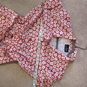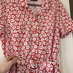 This vibrant red dress features a charming floral pattern, perfect for any occasion. Its elegant design offers both comfort and style.