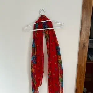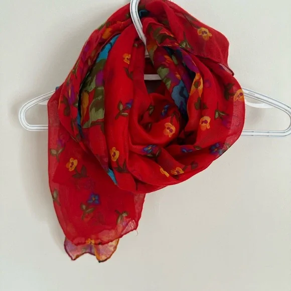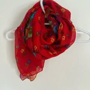 Add a pop of color to your outfit with this vibrant red floral scarf. Perfect for any occasion.