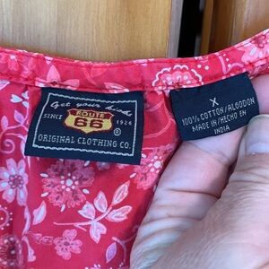 Size X. Brighten your wardrobe with this vibrant 100% cotton pink-red sleeveless top with stretch. Fabric has a white wash/fade look. Button front. Elastic around sleeves arm holes. Tie collar front. Featuring a charming floral pattern, it's perfect for any casual outing.