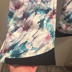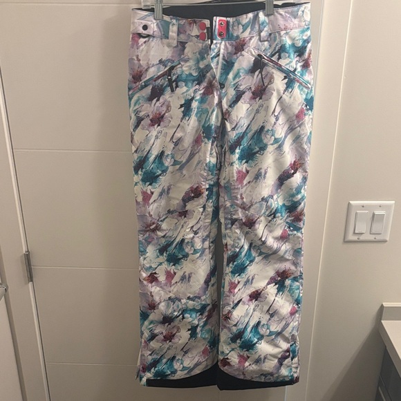 Vibrant snow pants with an abstract floral pattern. Size small, would fit as a medium as well.