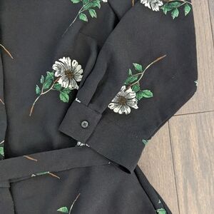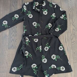 Really cute, workplace friendly romper from Banana Republic. It is long sleeves with buttons up the front, and then the shorts section has a clasp closure with a zipper. The waist can be cinched with a waist tie as well.