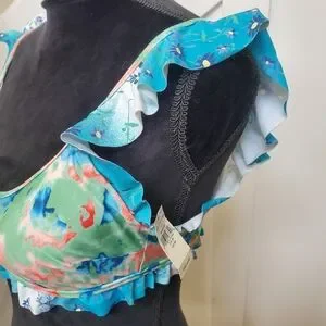 Embrace summer with this vibrant flowery bikini top. Featuring a playful ruffle design, it's perfect for beach days. The colorful floral pattern adds a fun touch to your swimwear collection.