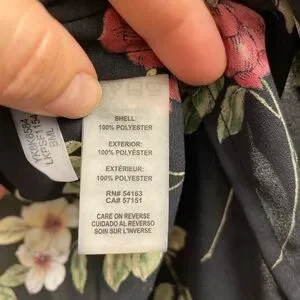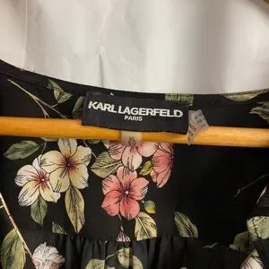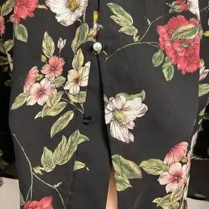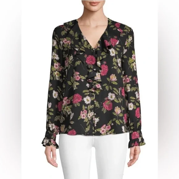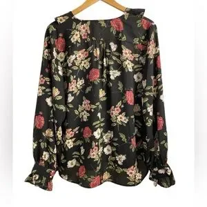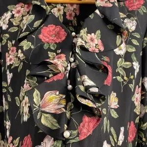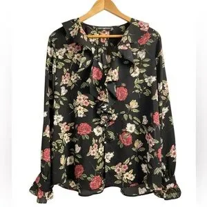 Elegant black blouse with floral print and ruffle details. Perfect for any occasion.