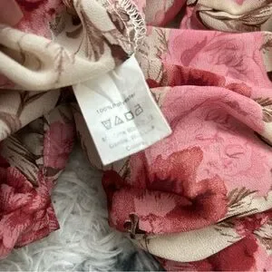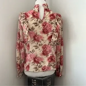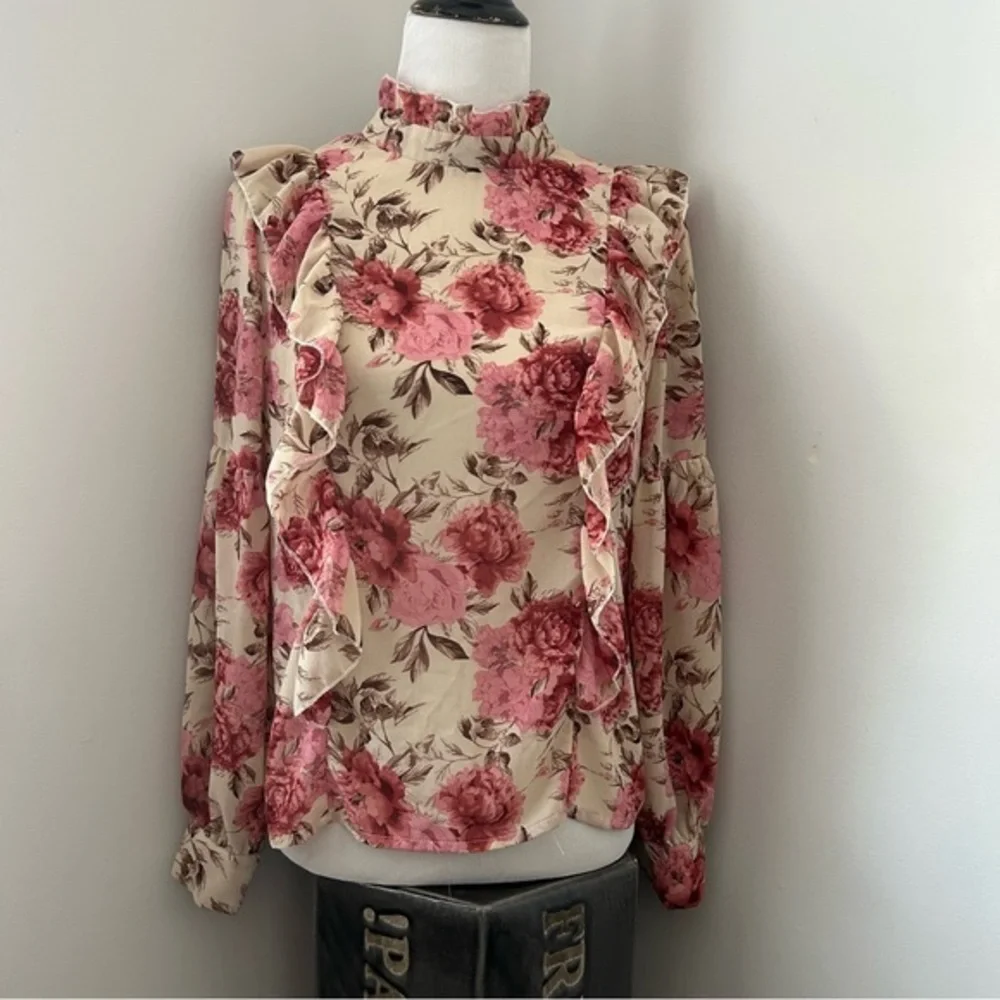 Elegant floral blouse featuring ruffle details. Long sleeves with button detail at cuffs. Keyhole opening in back with button closure.