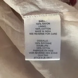 Shell 100% Rayon, Lining 100% Cotton