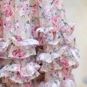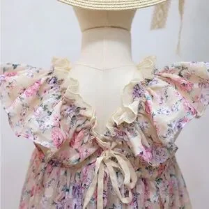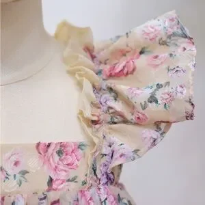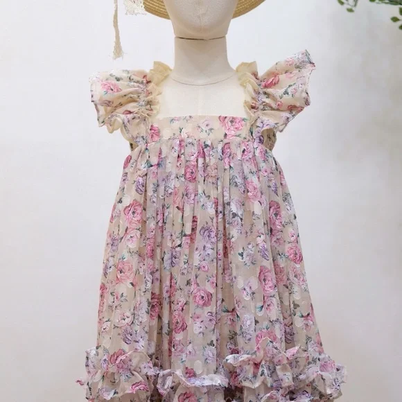 Charming floral dress with ruffle sleeves. Features a mix of pink and purple flowers on a cream background.