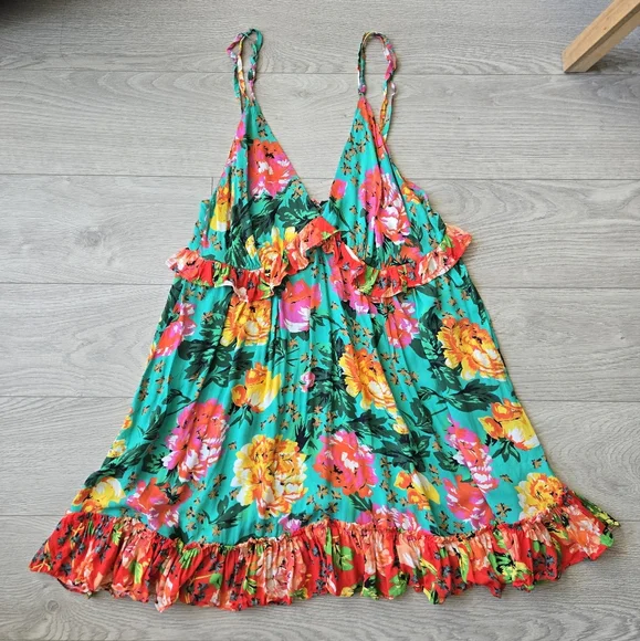 Vibrant floral dress with ruffle details from Cia Marítima. Features a mix of green, pink, and orange colors.