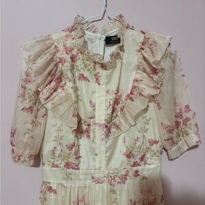 Elegant floral dress with ruffle details, perfect for any occasion. Features a beautiful cream base with pink floral patterns.