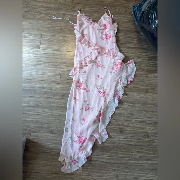 Elegant pink floral maxi dress with ruffle details. Perfect for any occasion.