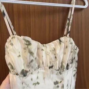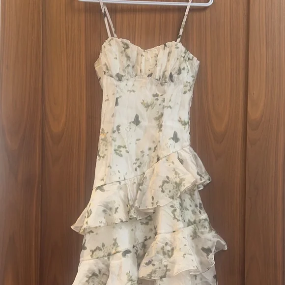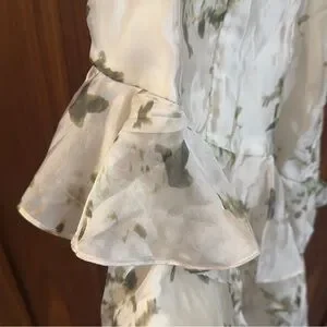 Elegant floral dress with ruffle details. Features a delicate floral pattern on a cream background.