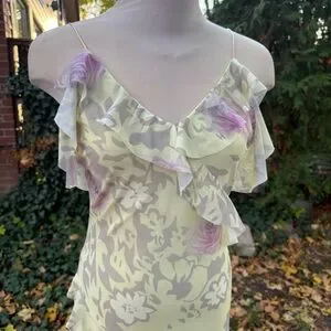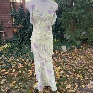 Elegant floral maxi dress featuring delicate ruffles. Perfect for any occasion with its cream and purple hues. Mesh fabric