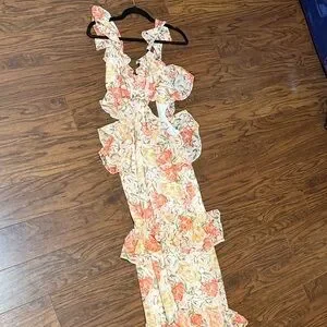 Elegant floral maxi dress with ruffle details. Features vibrant orange and cream colors.