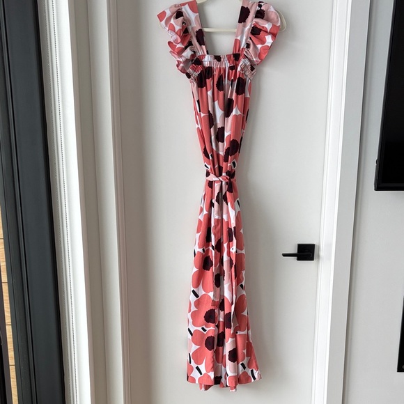 Elegant maxi jumpsuit with ruffle sleeves. Features a vibrant floral pattern in pink, red, and black. Soft, very light material, pockets and tie belt for waist
