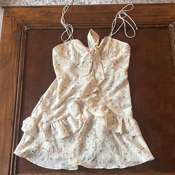 Elegant cream dress with delicate floral pattern. Ideal for any occasion. Worn once in great condition. size runs very small would say this would be considered a small medium not large.