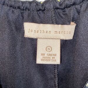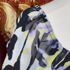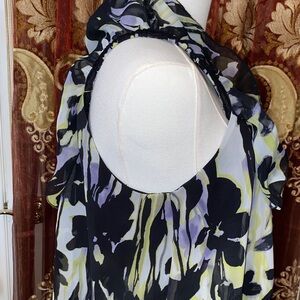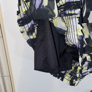 Elegant blouse with layered design. Features black and white floral pattern. Ideal for a chic look.