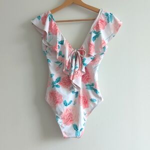 Stylish one-piece swimsuit with floral print and ruffle details. Features a vibrant design with pink and blue flowers on a white background.