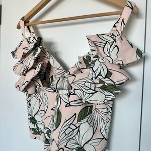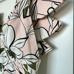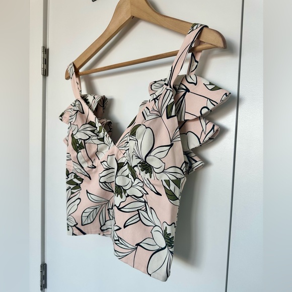 A soft, feminine Itala tank featuring a blush‑pink base with bold botanical florals in white, black, and deep green. The ruffled straps add a delicate, sculptural touch, and the structured back zipper gives it a clean, tailored finish. The lightweight fabric makes it perfect for warm weather or pairing with high‑waisted denim or skirts.