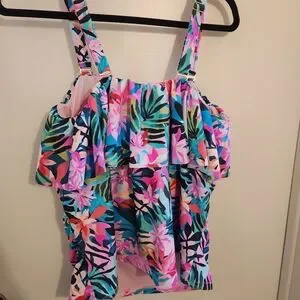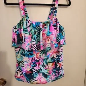 Vibrant floral tankini top with ruffle detail. Perfect for a stylish swim.
