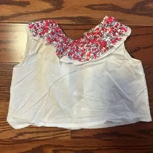 Chic and stylish, this white top features a vibrant floral ruffle. Perfect for adding a touch of elegance to any outfit.