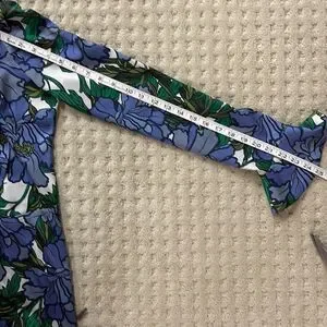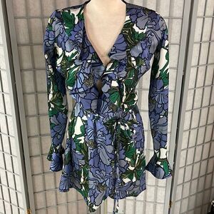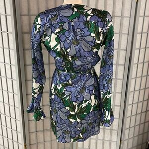 This elegant floral ruffle wrap mini dress features a vibrant blue and green pattern. Perfect for any occasion, it offers a stylish and comfortable fit.