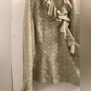 Elegant light green blouse with floral patterns and ruffle details. Perfect for a sophisticated look. It has a skirt . Put to pit is 51 cm, shoulder to shoulder is 38 cm , height from shoulder to hips is 58 cm . Waist is 46 cm . Waist can be adjust as it is wrap .