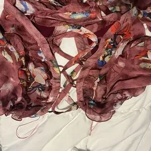 Elegant floral dress with ruffled details and open back. Features a rich burgundy color with multicolor floral patterns.