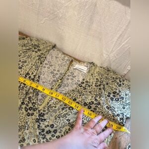 Combinaison courte vert sauge à imprimé fleuri noir de chez Urban Outfitters. Encolure croisée en V, manches bouffantes élastiquées, ceinture cousue non amovible à la taille, finition festonnée aux jambes.