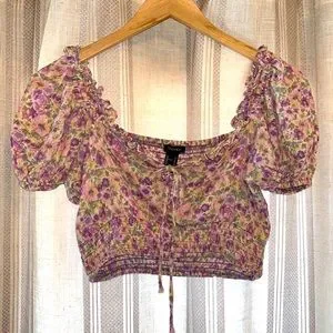Top has tie up feature, can be worn off the shoulder, bubble sleeves and elastic under bust for flattering fit.