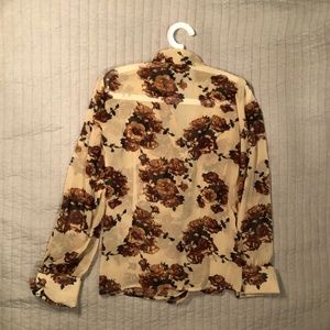 Floral sheer blouse with neck tie and button on cuffs.