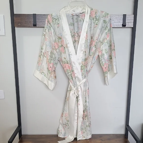 Elegant sheer kimono robe with a floral design. Features a beautiful blend of cream and pink colors. Perfect for adding a touch of luxury to your sleepwear collection.