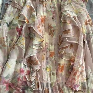 Chic sheer blouse with floral patterns and ruffle details. Perfect for a stylish look.