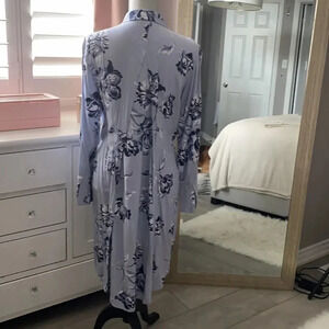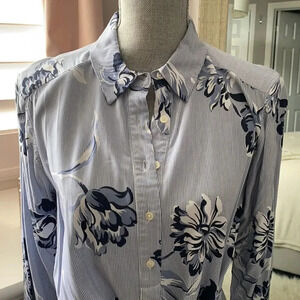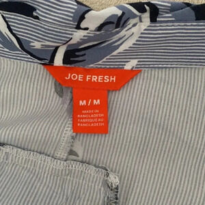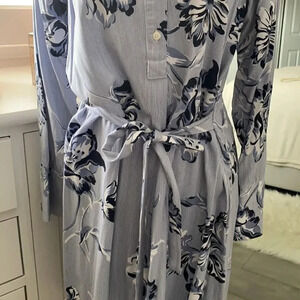 JOE FRESH Rayon dress with blue and white floral print and tiny pinstripe background. Tie front or back with collar and button down detail. Excellent condition like new.