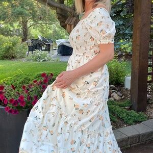 An "amidst a field of flowers" type of dress. Adorned with a subtle floral print and a smocked bodice, it's a showstopper crafted for spinning on the dance floor. Highlighting a square neckline, ruffle accents on the tiered skirt, and our distinctive elastic puff sleeves.