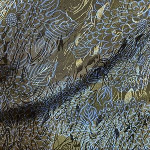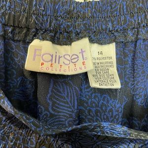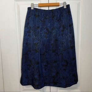 Petite skirt is royal blue floral on black background. Also has tons on tone print beneath floral. Front release pleating and back elastic waist. Button closure on left side with one pocket. In EUC.