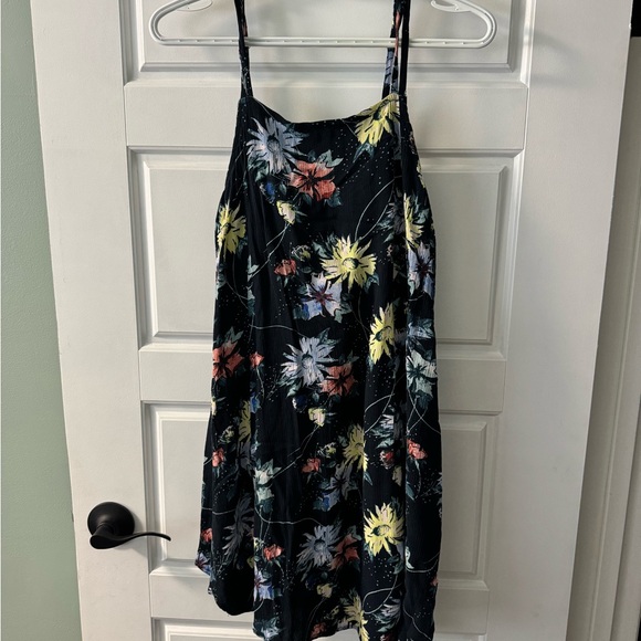Chic floral dress with spaghetti straps. Features a vibrant floral pattern on a dark background.