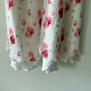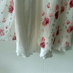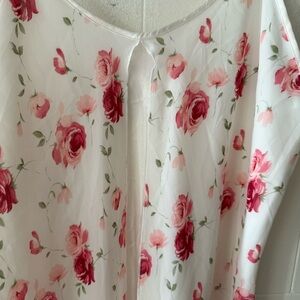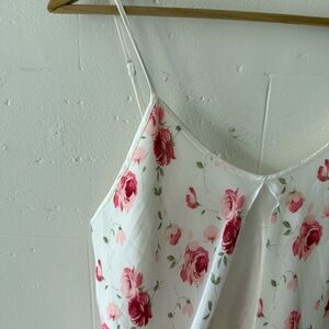 Okay, can we talk about how cute this Lingeria dress is?! This white slip dress with rosy pink and red florals has the prettiest little slit detail at the neckline and a soft, flowy open hem with a gorgeous satin under layer. It’s super lightweight and comfy, perfect for summer nights at home, or layering with a chunky sweater for cooler weather. In excellent pre-owned condition.