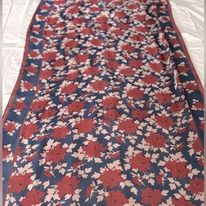 Meet your year-round style hero: a lightweight, oversized scarf that works as a wrap, shawl, or neck scarf. Deep navy sets the stage for rich red blooms and soft cream leaves—perfect for pairing with denim, leather, or your favorite trench.