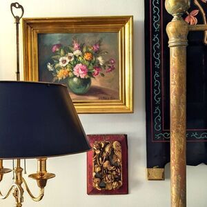Moody, romanticized oil floral, signed. Stunning gilded gold frame. The visual impact can't be ignored. Beautiful, affordable, original artwork, the value of which will only increase with time.