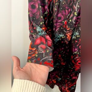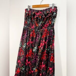 This vibrant floral strapless swim cover-up is perfect for a day at the beach. The bold red and green colors make a stylish statement.
